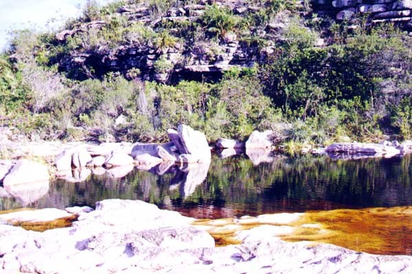 Figura 6: Rio Tiburtino, Mucugê, BA, 1998. O Memorial 2003 da Espiral começava com essa imagem e o texto: “Rio Tiburtino, em Mucugê, BA. Que significados nos traz a paisagem refletida na água em um trecho tão sereno do rio, logo antes de algumas quedas? Quais os sentidos da água na paisagem? Quais os sentidos da paisagem para nós? E a pergunta que nos deve ensinar as outras: quais os nossos sentidos na paisagem?”. Foto Euler Sandeville Jr.