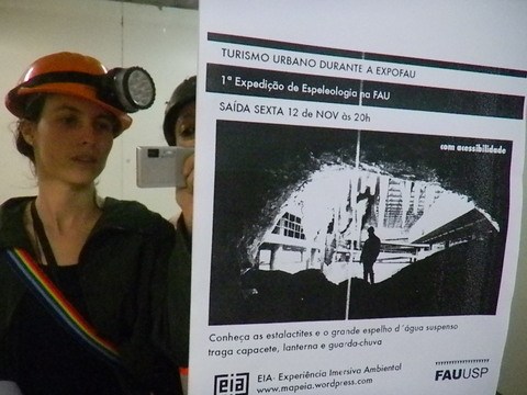 Figura 4: Ação do EIA na FAU, 2010. “Turismo urbano durante a EXPOFAU. 1a. Expedição de Espeleologia na FAU. Conheça as estalactites e o grande espelho d’água suspenso. Traga capacete, lanterna e guarda-chuva”. Foto Euler Sandeville Jr.
