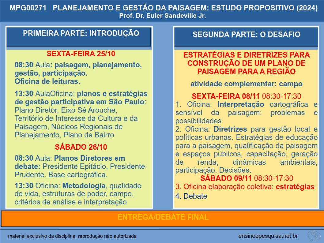 Planejamento e Gestão da Paisagem: Estudo Propositivo (2024) é uma disciplina aplicada à solução de problemas. Na primeira semana teremos a apresentação de fundamentos de planejamento e gestão urbana a partir de exemplos de casos concretos em algumas cidades. Na segunda semana haverá uma oficina propositiva conjunta, a ser desenvolvida em equipe para discutir princípios e estratégias em um caso específico.