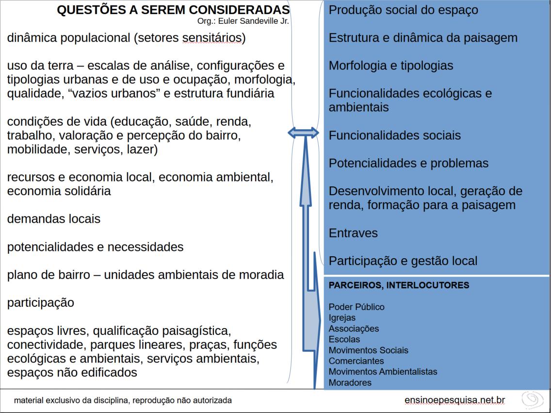 Desenvolveremos ensaio crítico e propositivo de interpretação dos processos e dinâmicas de produção das paisagens e do planejamento municipal, relacionando diferentes escalas, ancorado em uma visão crítica dos processos sociais de produção e apropriação do espaço, considerando contribuições da ecologia, do planejamento da paisagem, da participação social, bem como na perspectiva de uma pedagogia da paisagem.