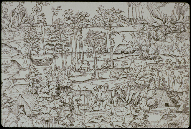 Figure des Brasiliens (n “Festa dos Brasileiros”), Rouen, 1550, quando da entrada do rei Henrique II e sua esposa, Catarina de Médici na cidade em 1° e 2 de outubro de 1550. “Realizaram-se encenações que envolveram cerca de 50 indígenas trazidos da colônia do Brasil, além de 250 marinheiros normandos e bretões habituados à terra nova e falantes de tupi, postos como figurantes fantasiados de silvícolas, e mulheres francesas (alguns apontam como prostitutas locais) nos papéis femininos.” (https://pt.wikipedia.org/wiki/Festa_brasileira_de_Rouen_em_1550).